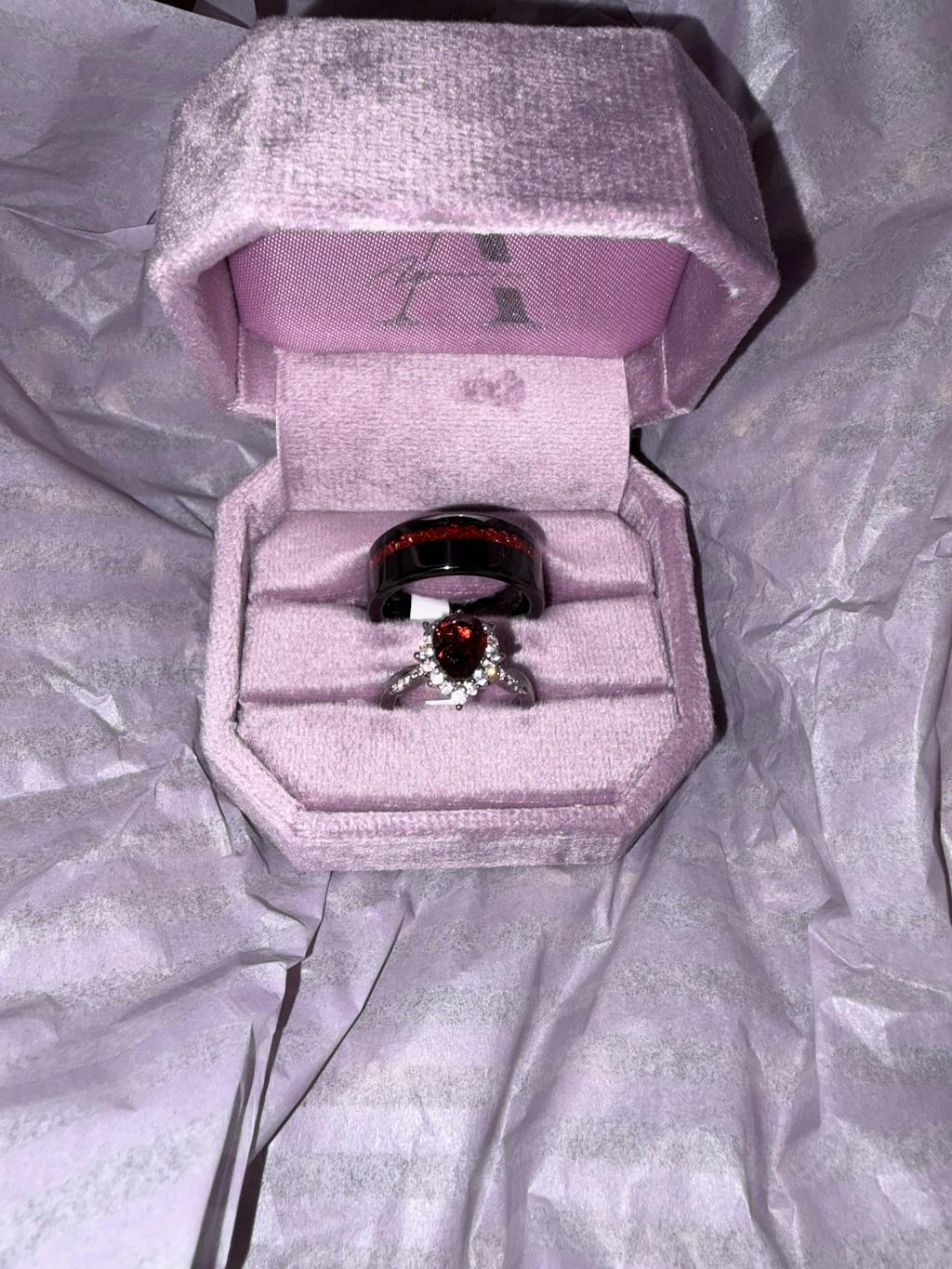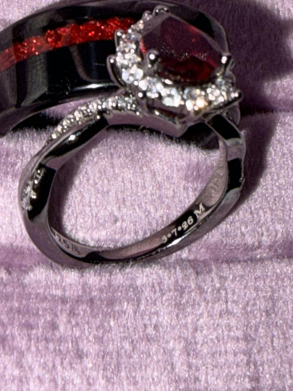 Celebrate your connection with this striking Natural Red Garnet Couples Ring Set. Her ring features a bold red garnet center stone, while his band showcases a unique inlay of crushed garnet, creating a perfectly balanced and coordinated design. Set against sleek black bands, the vivid red garnet symbolizes passion, strength, and lasting love. Whether for a wedding, anniversary, or promise, this set is ideal for couples seeking rings that are both meaningful and visually bold.