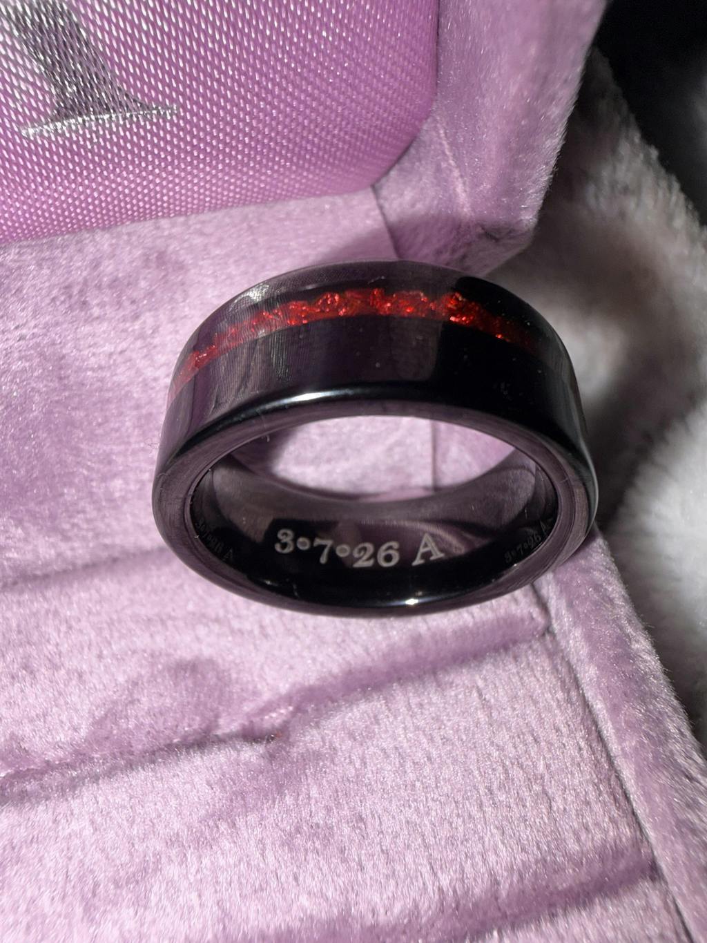 ►His band, crafted from durable black tungsten carbide, showcases a sleek 8mm flat design with a polished finish and a captivating crushed garnet inlay, offering a bold yet sophisticated look.