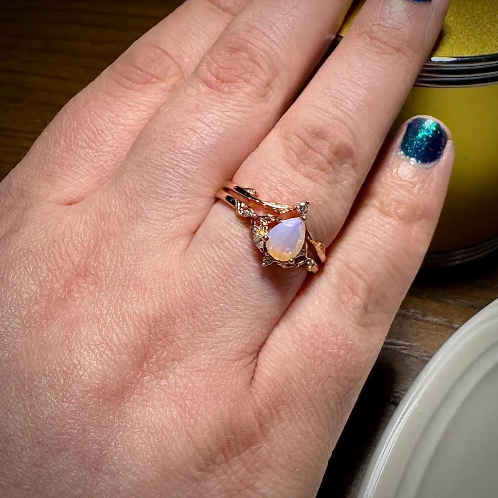 My girlfriend loves her ring! While I’m not sure I would describe this pink sapphire as “opalescent” it is very beautiful as are the details on the ring itself. It shipped faster than estimated and the seller was so kind and quick to reply to my questions. It came with cute packaging and a lovely velvet ring box as well.