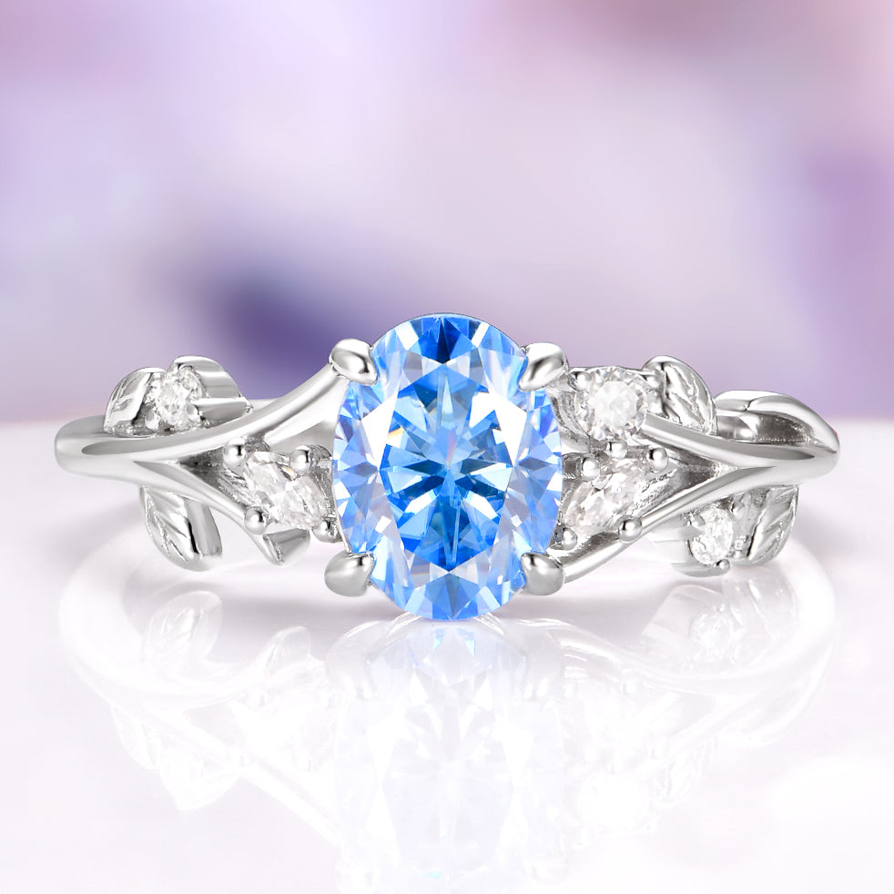 This Certified Vivid Ice Blue Moissanite Engagement Ring features a luminous 6x9mm oval-cut moissanite center stone in a captivating ice-blue hue. The elongated oval silhouette enhances finger length while maximizing brilliance and fire.