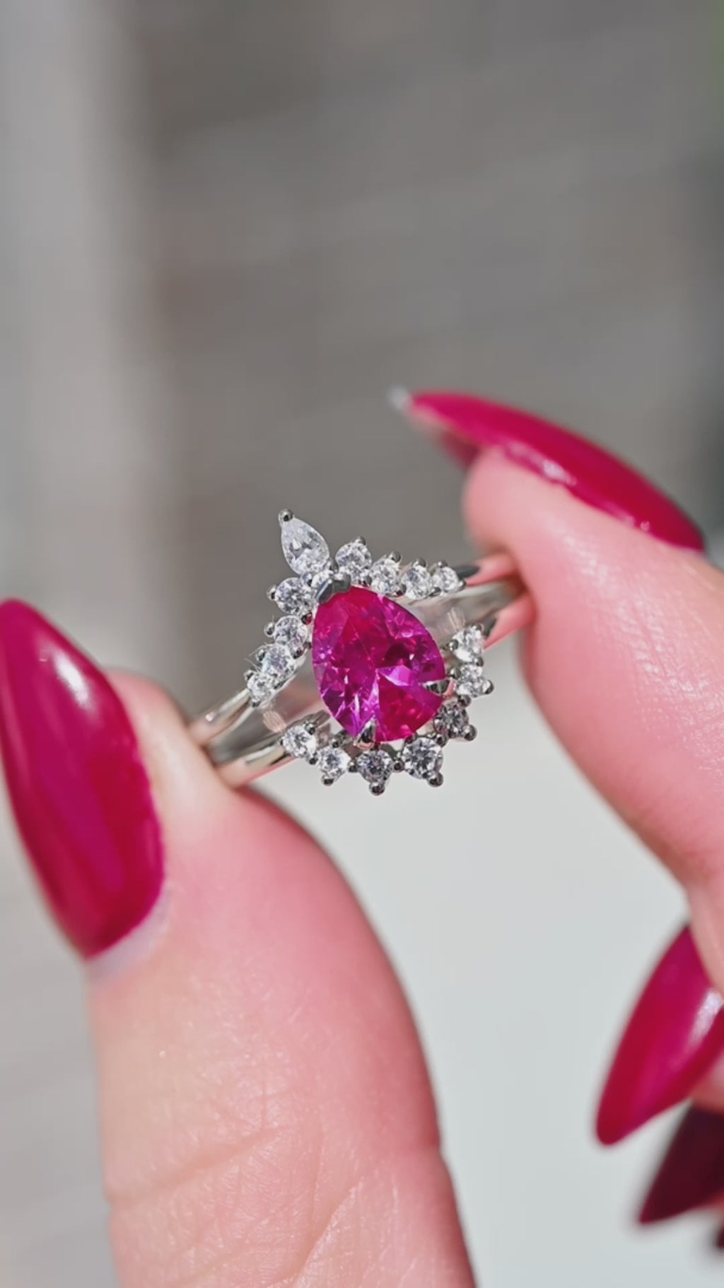 This ring is a beautiful choice for anyone looking for a non-traditional engagement ring or a September birthstone gift. Its soft pink sparkle and teardrop shape symbolize romance, grace, and individuality.