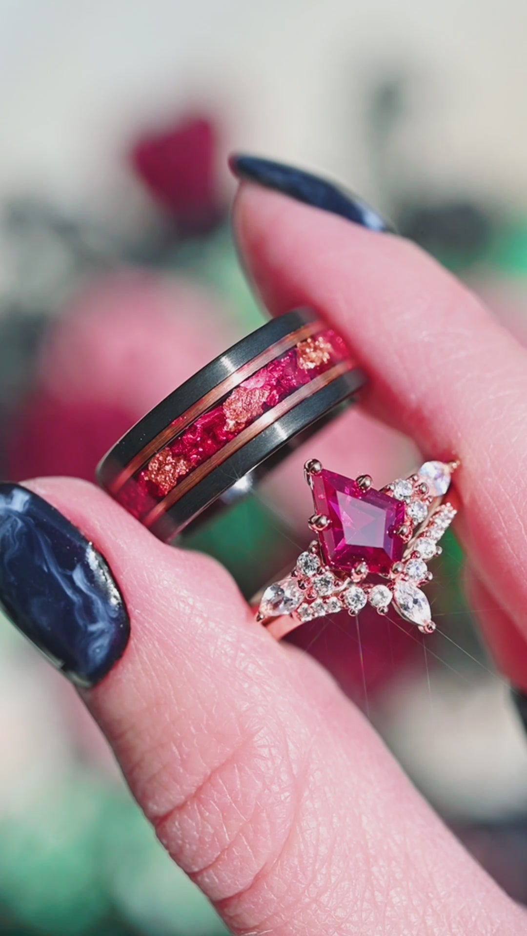 ►Material: Tungsten Carbide, Ruby, and Rose Gold Leaf