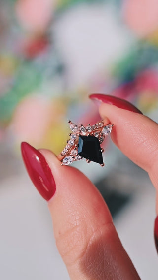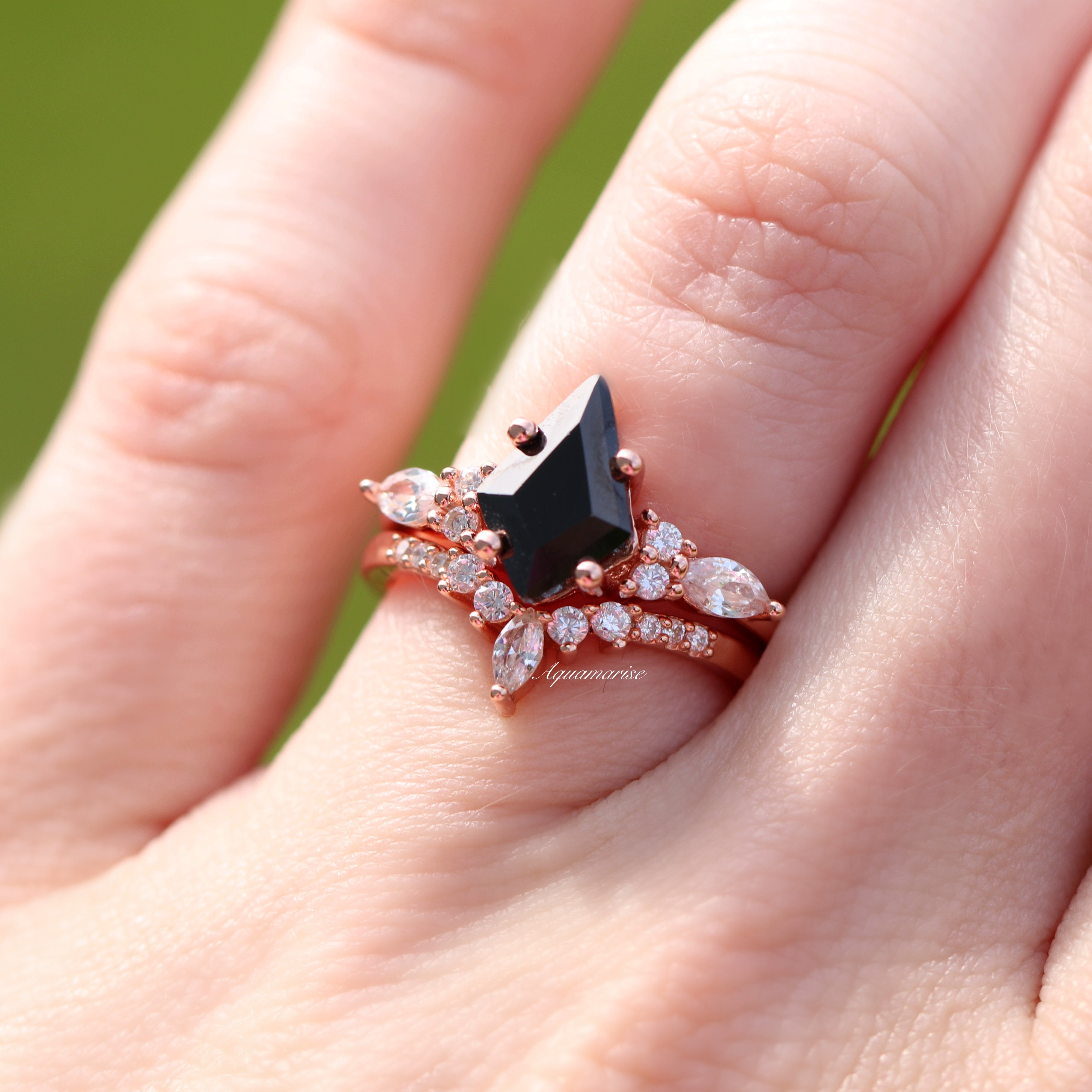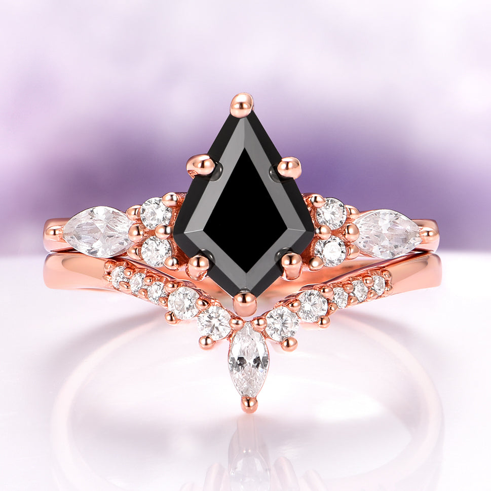 Elevate your style with this vintage inspired black onyx ring set, designed to capture timeless elegance with a bold, modern twist. Featuring a striking kite-cut natural black onyx center stone framed by sparkling simulated diamonds, this set makes a stunning choice for engagements, anniversaries, or as a unique statement piece.