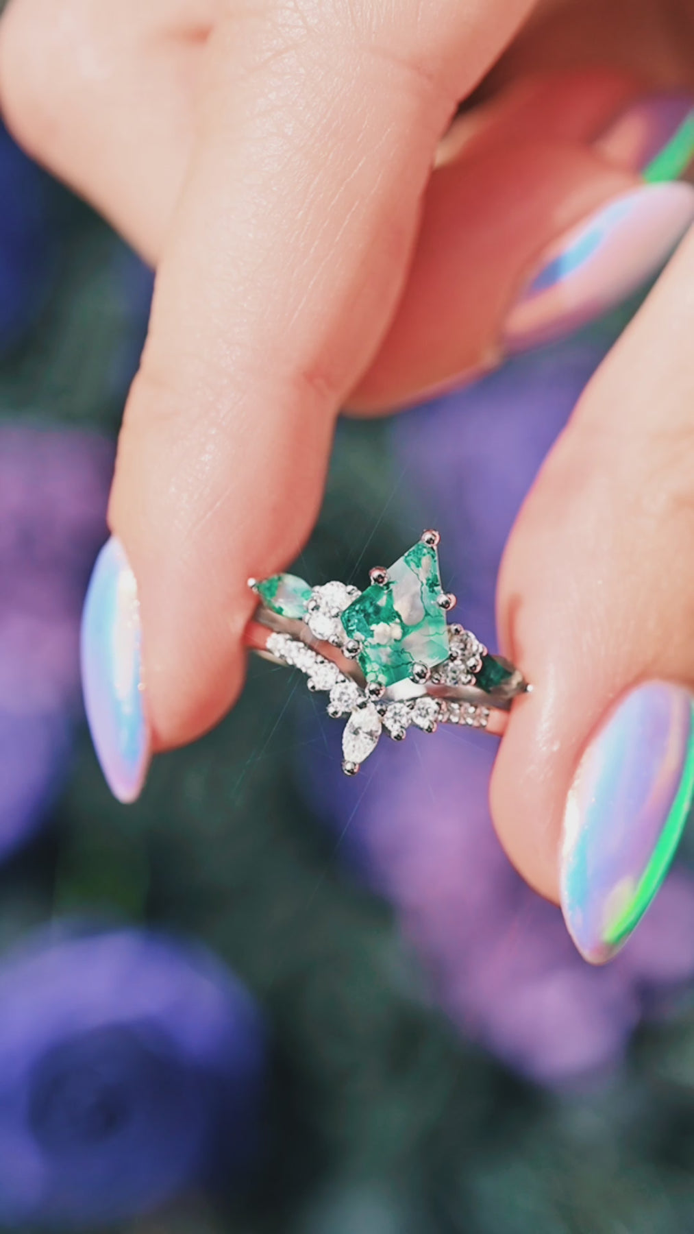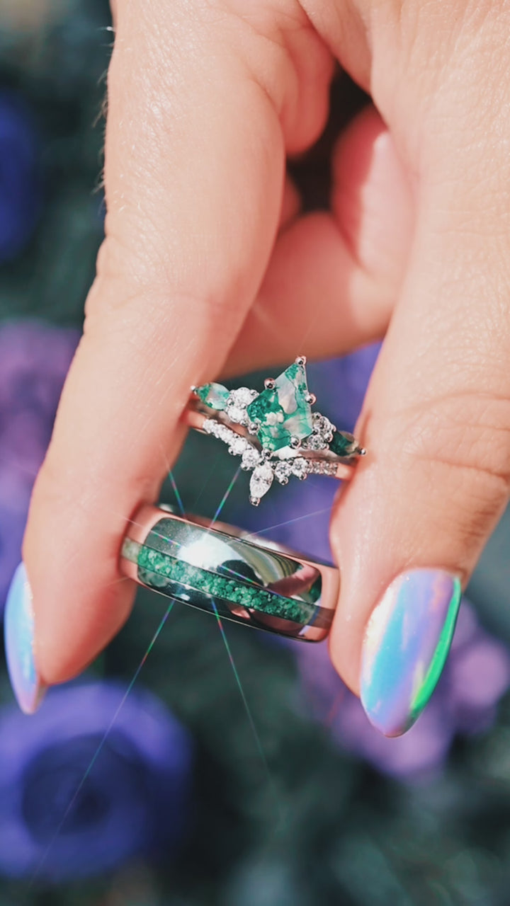 Each piece highlights the organic elegance of natural Green Moss Agate, a gemstone treasured for its mesmerizing moss-like inclusions that resemble leaves and foliage. These one-of-a-kind patterns make every ring as unique as the bond it represents.