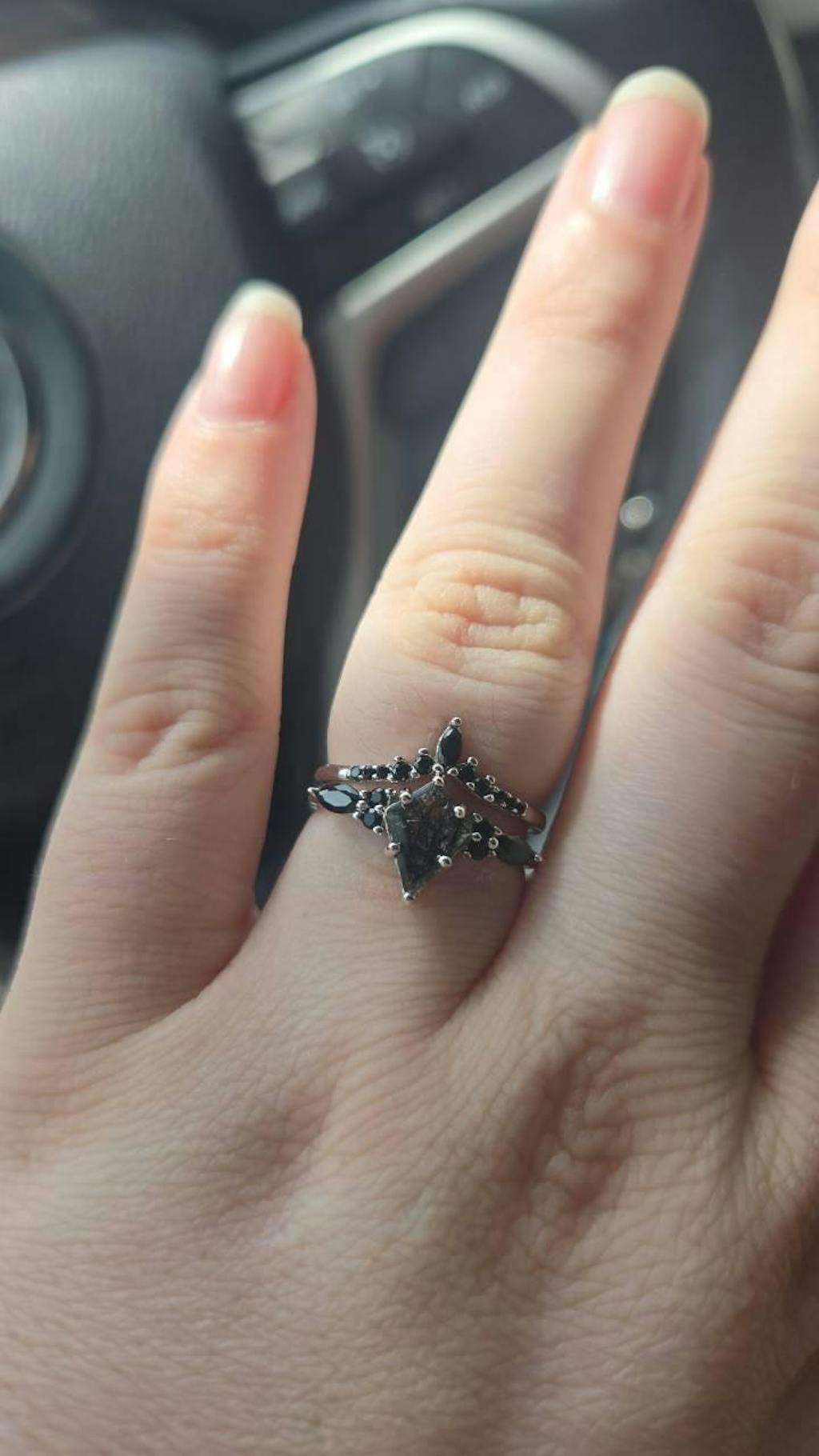 Skye Kite Cut Natural Rutilated Quartz & Black Onyx Skye Ring Set, a stunning embodiment of timeless elegance and shared love. Crafted with meticulous attention to detail, this enchanting ring set is a symbol of connection, harmony, and the unique bond between two individuals.