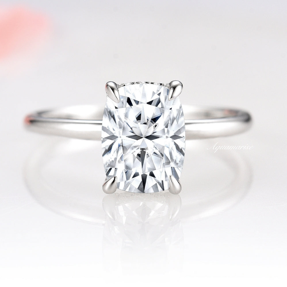 This elegant solitaire features an open basket with claw prongs that cradle the center gem. The petite band adds to the sleek, classic look of this ring. The hidden halo makes this ring truly spectacular.
