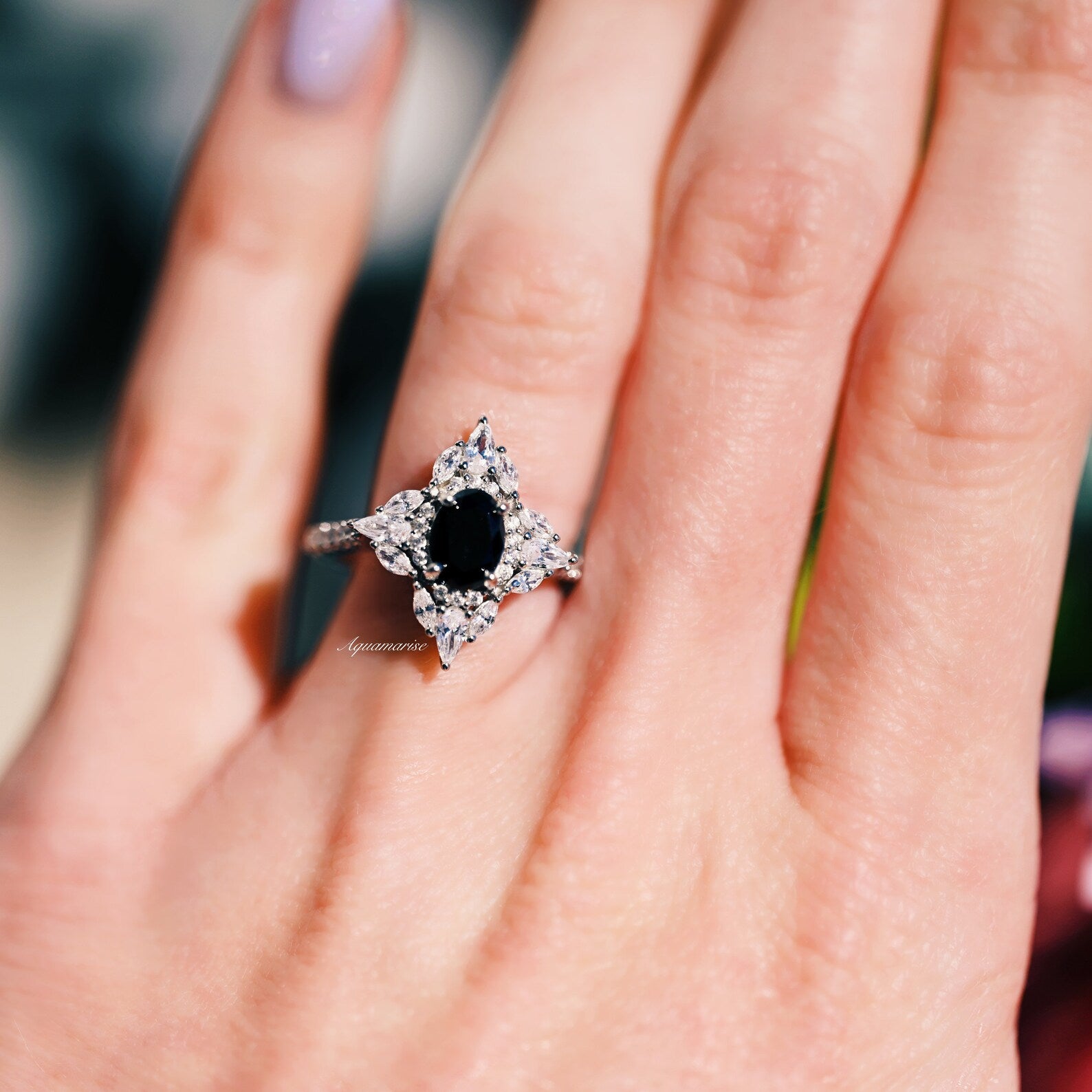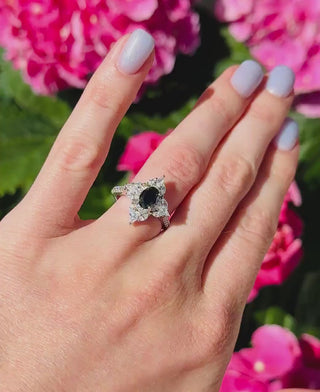 Make a statement with the Stella Black Moissanite Ring in 14K Solid White Gold, a vintage-inspired design that balances elegance and drama. Featuring a striking oval-cut black moissanite center stone, this ring captures light with its deep, reflective brilliance while offering the superior durability and sparkle moissanite is known for. Accented with shimmering moissanite side stones, this piece radiates sophistication from every angle.