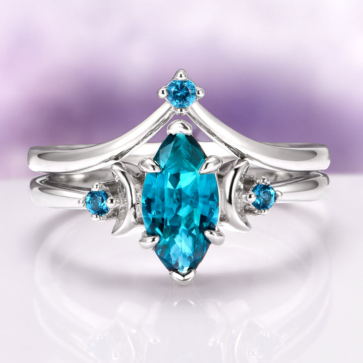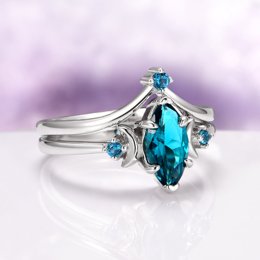 Celebrate your love with this enchanting Teal Sapphire Moon Engagement Ring Set, designed for the dreamer who seeks elegance with a touch of magic. Crafted in 14k white gold, this set features a stunning marquise-cut teal sapphire at its heart, a gemstone known for its vibrant hue and captivating sparkle. The crescent moon design cradles the sapphire, symbolizing eternal love and celestial beauty.