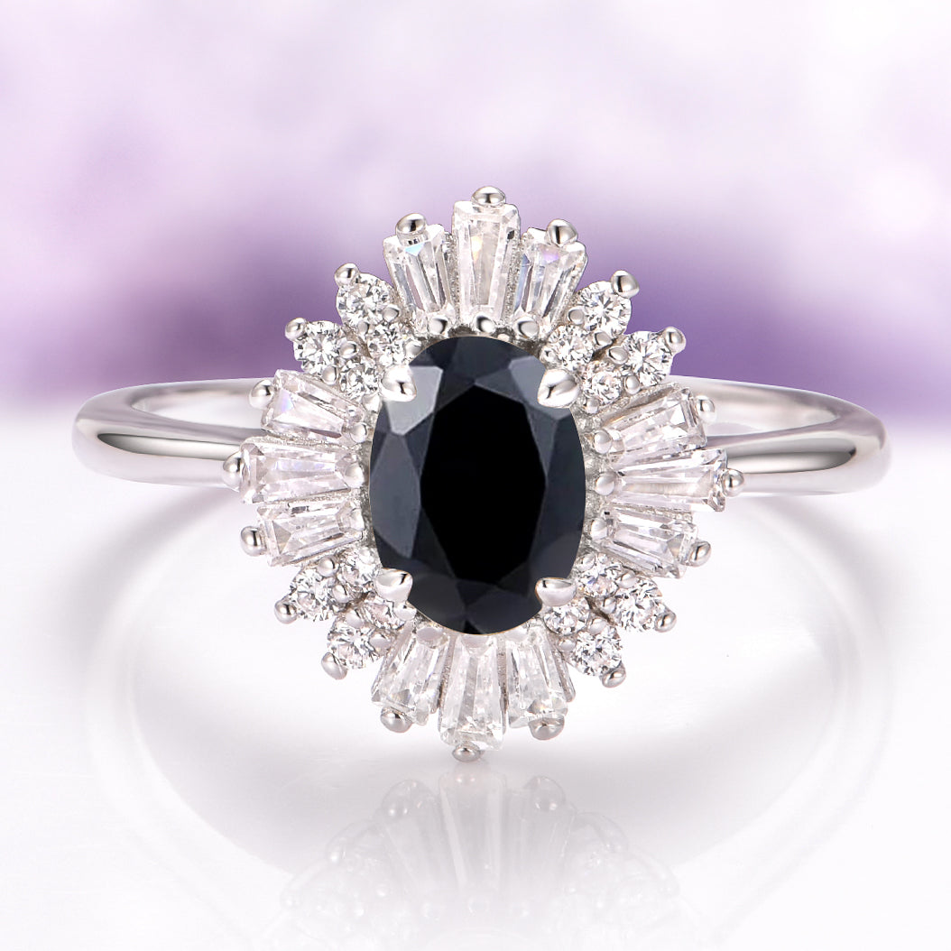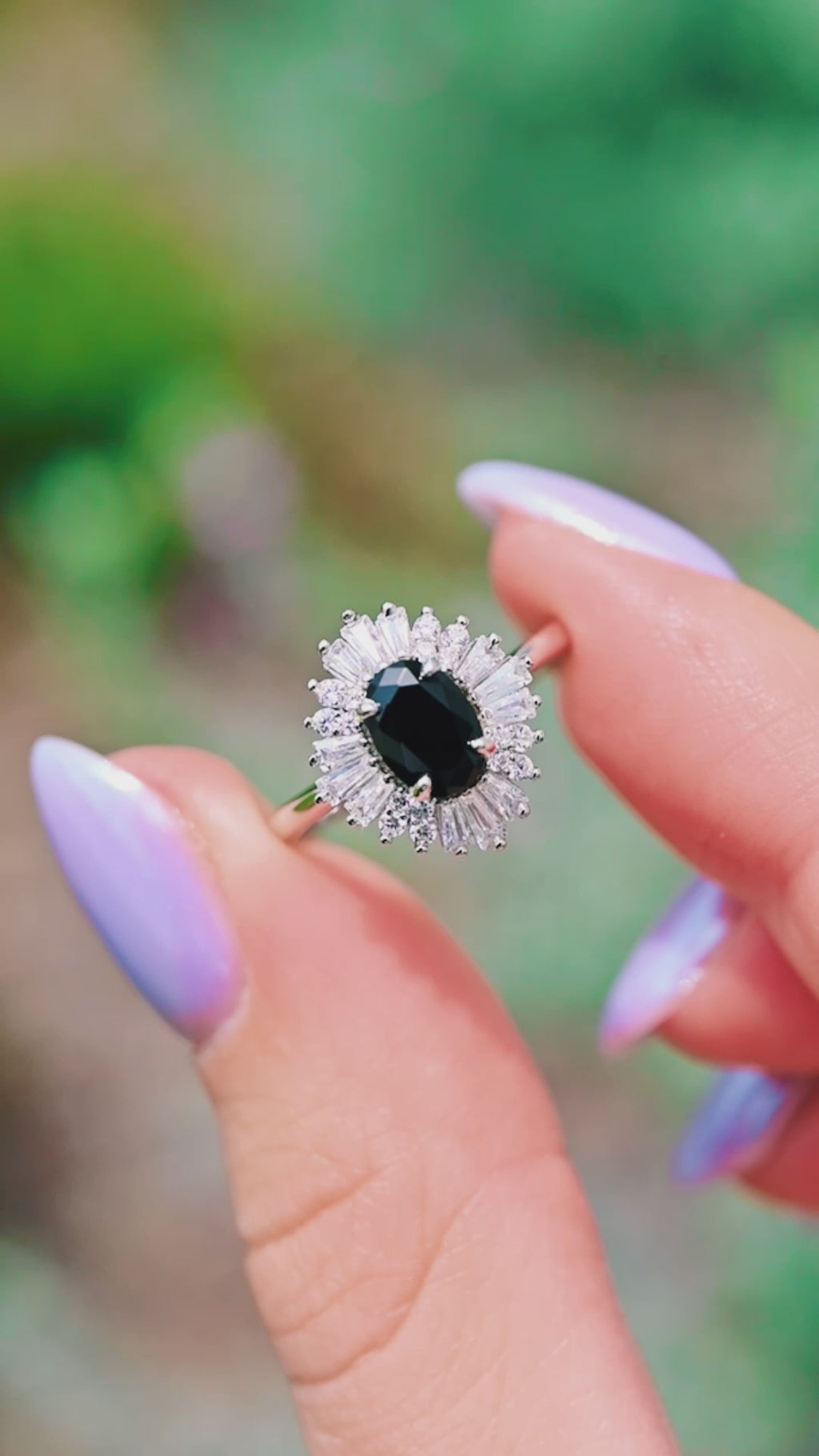 The Victoria Black Onyx Ring in 14K solid white gold is a bold, vintage-inspired piece, featuring a captivating oval-cut natural black onyx as its centerpiece. Encircled by brilliant moissanite accents, this ring exudes timeless elegance with a modern edge. The rich black onyx symbolizes strength, grounding, and protection, while the sleek white gold band offers a refined and contemporary touch. With its striking contrast and classic silhouette, this ring is a perfect choice for an engagement, anniversary gift, or heirloom piece, ideal for those who appreciate elegant, non-traditional fine jewelry.
