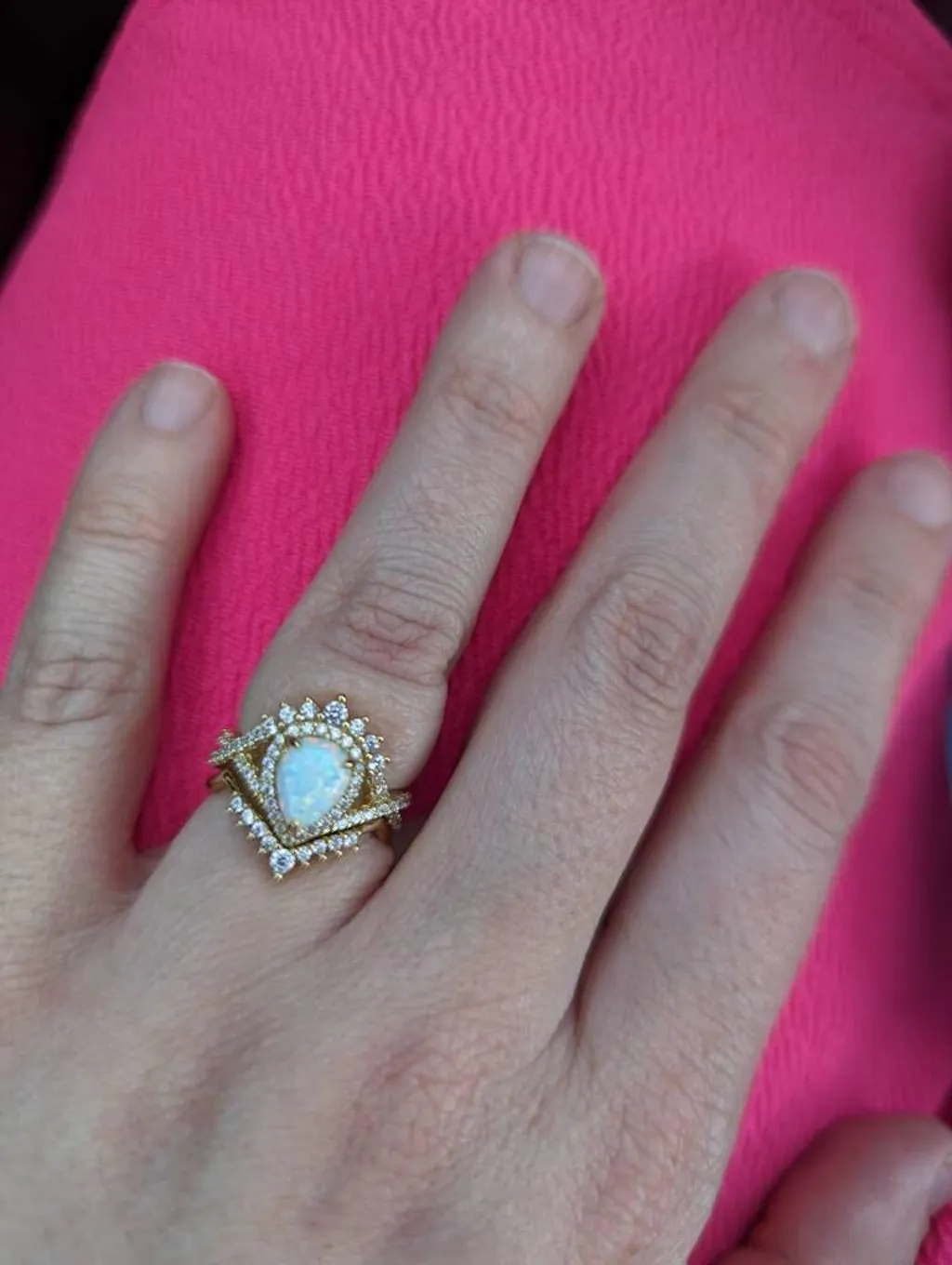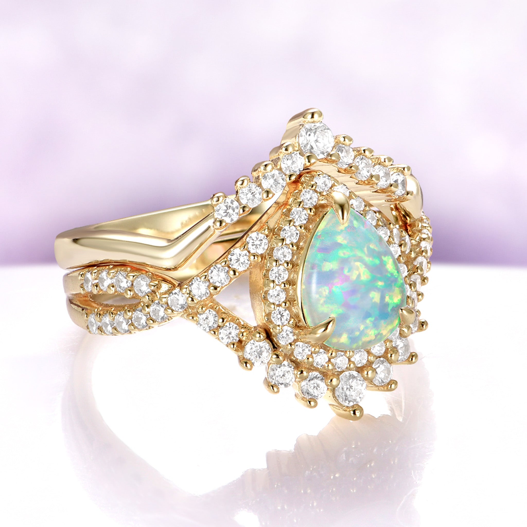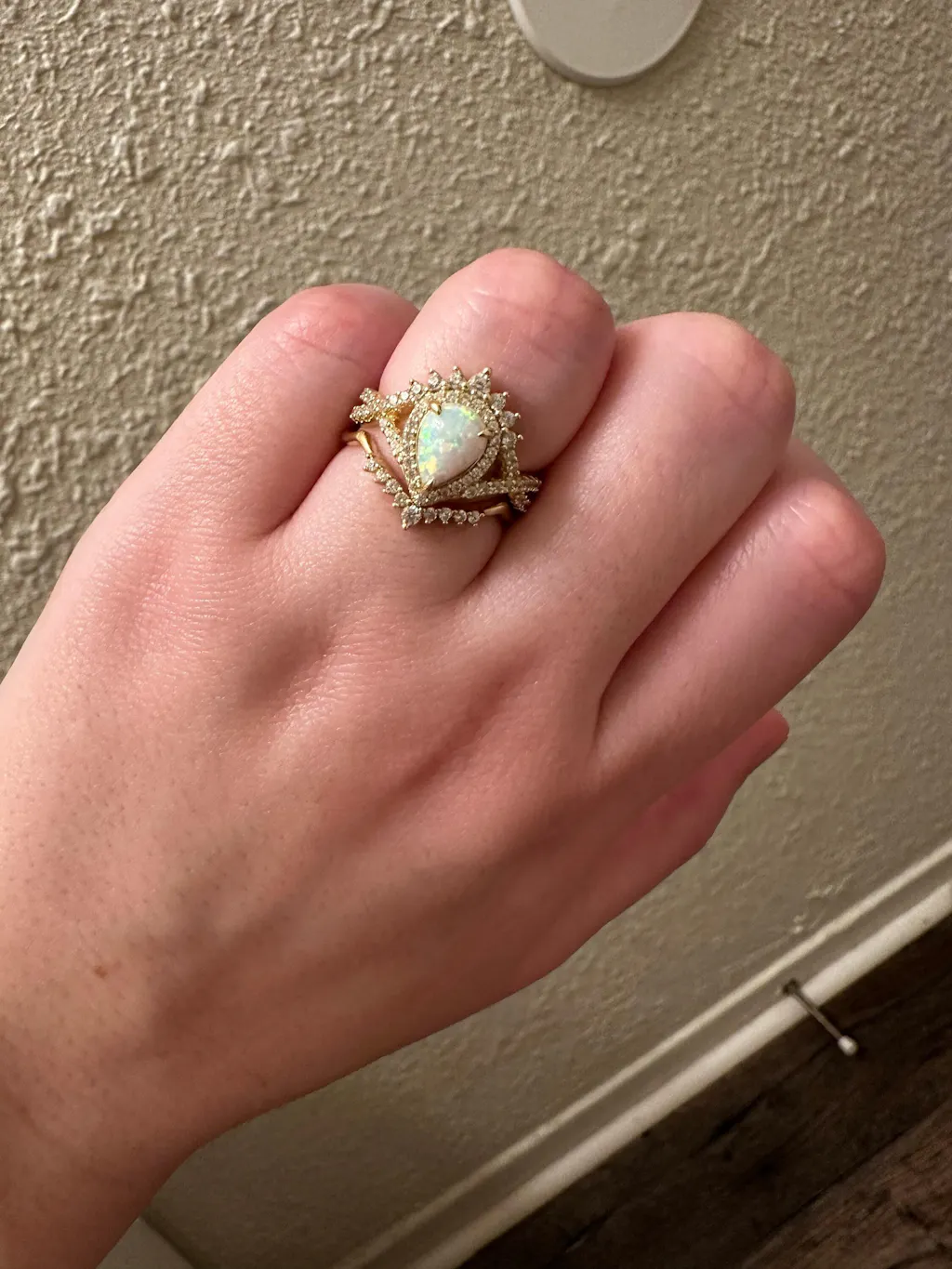 Ethereal, radiant, and undeniably captivating—this Vintage Inspired Opal Ring Set is designed for those who want a ring that feels magical, timeless, and completely unique. Featuring a glowing pear-shaped opal center stone surrounded by a brilliant halo, this set captures light, color, and movement in every angle.